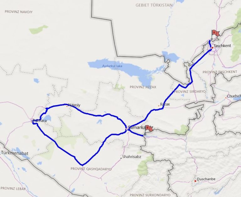 Unsere Route führte uns zuerst nach Taschkent. Von dort ging es weiter nach Samarkand und nach Buchara. Bevor wir Usbekistan wieder verließen, waren wir noch einmal in Samarkand.