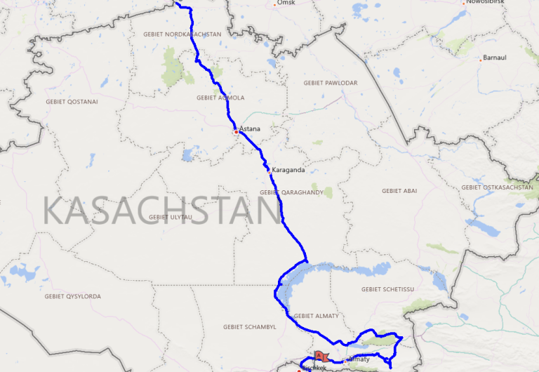 Unsere Route durch den 2. Teil von Kasachstan führte uns zuerst nach Almaty. Weiter ging es an der Charyn-Schlucht vorbei nach Kegen und von dort zur Singenden Düne bei Basshi. Über Priosersk, Balqasch und Karaganda fuhren wir in die Hauptstadt Kasachstans Astana. Die letzte Station in Kasachstan war Petropavl. Danach ging es wieder nach Russland.