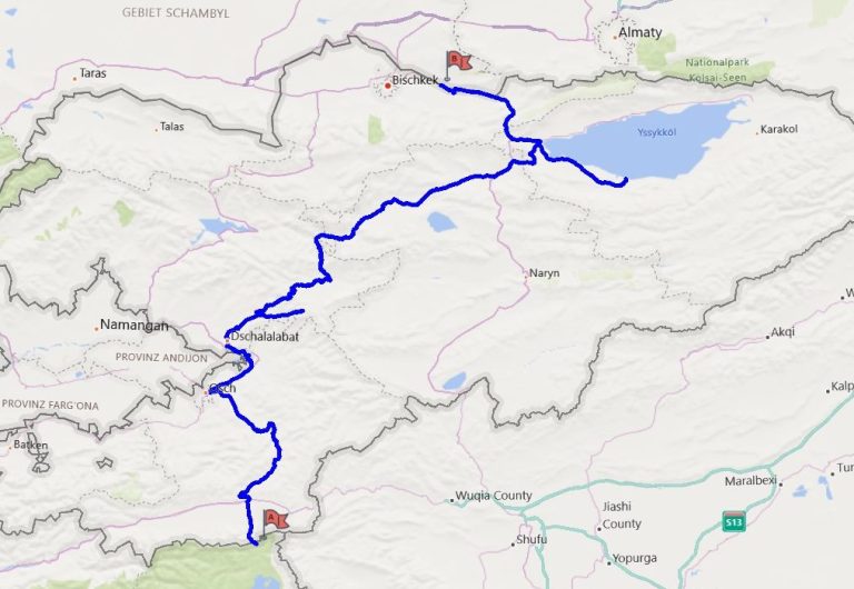 Unsere Route durch Kirgisistan führte uns zuerst nach Osch. Von dort ging es u.a. über die 90-km-Piste nach Kazarman und weiter nach Kotschkor und Tong am Issy-Kul, wo wir 3 Nächte in einem Yurtenlager blieben. Die letzte Station hieß Tokmok, gleich an der Grenze zu Kasachstan.