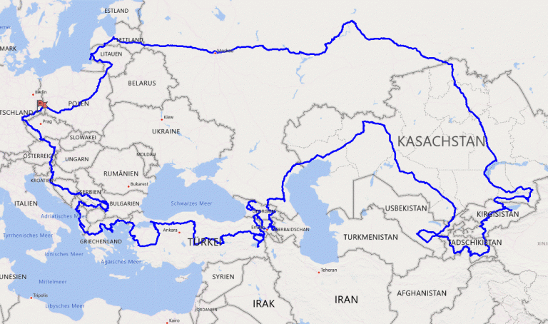 Hier ist unsere gesamte Reiseroute als Videoanimation zu sehen. Wir fuhren von Dorfhain über Tschechien, Österreich, Slowenien, Kroatien, Serbien, Bulgarien, Montenegro, Albanien, Griechenland, Türkei nach Georgien. Von dort machten wir einen Abstecher nach Armenien und fuhren zurück nach Georgien. Weiter ging es durch Russland, Kasachstan und Usbekistan zum Pamir-Highway nach Tadschikistan. Nach dem Meistern des Pamir-Highways ging es nach Kirgisistan und wieder zurück über Kasachstan, Russland, Lettland, Litauen, Polen nach Hause.